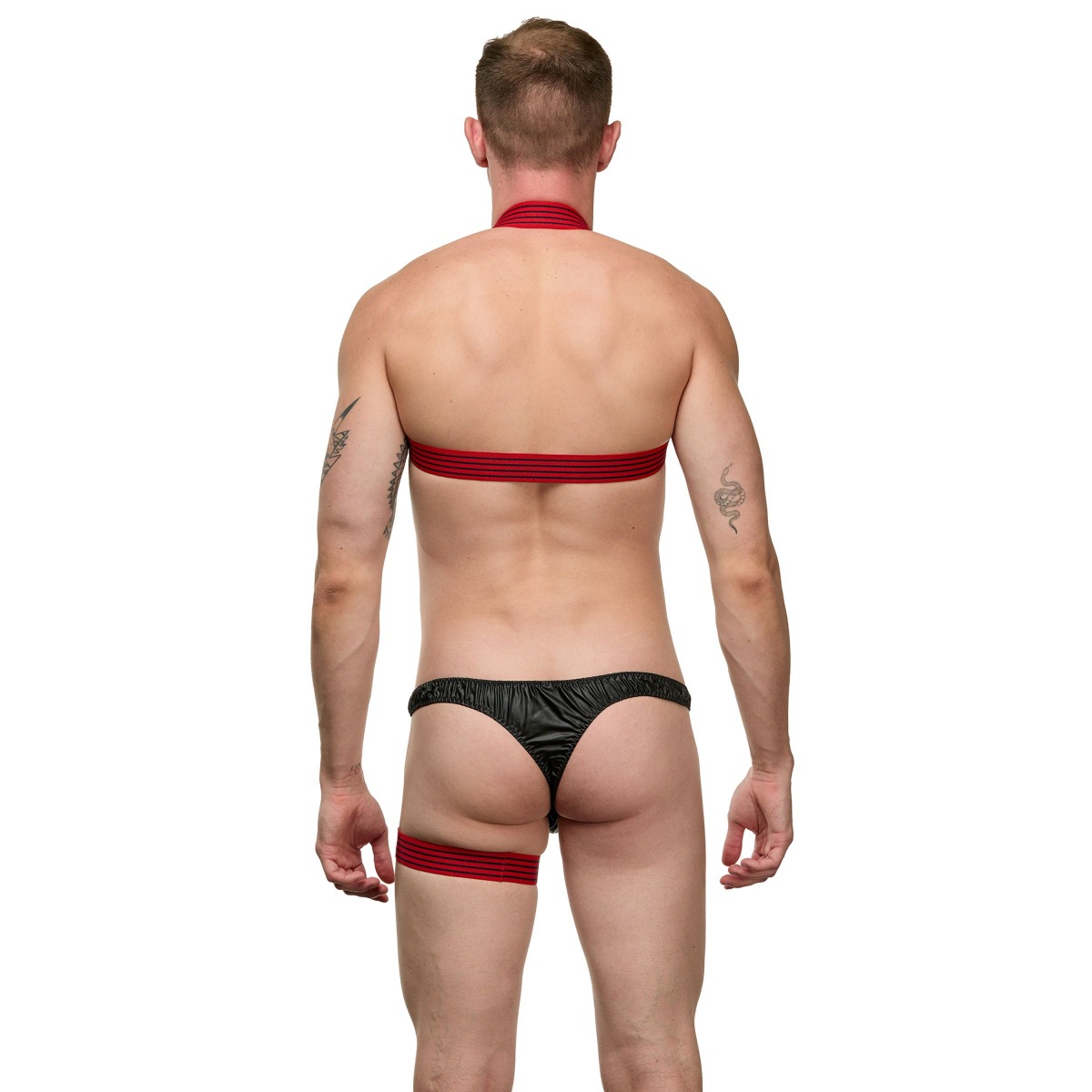 Мужской костюм «Танцор». Выполнен в черно-красном цвете и состоит из 3 предметов. В комплекте: трусы-тонги, подвязка на ногу, портупея.