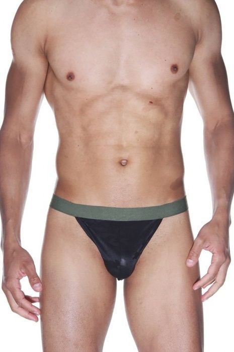 Черные трусы-тонги из гладкого блестящего материала. Трусы с низкой посадкой, на широкой резинке камуфляжного цвета.
