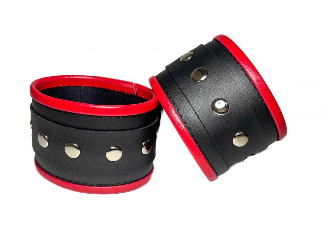 Красивые и функциональные наручники, выполненные из искусственной кожи. Декорированы металлической фурнитурой и красными вставками по краям. Обхват удобно регулируется с помощью пряжек. В комплекте идет соединение с карабинами. Очень экономичный, экологичный и практически незаменимый аксессуар для вашей любовной игры! Ширина - 5,5 см. Длина соединения - 11 см.