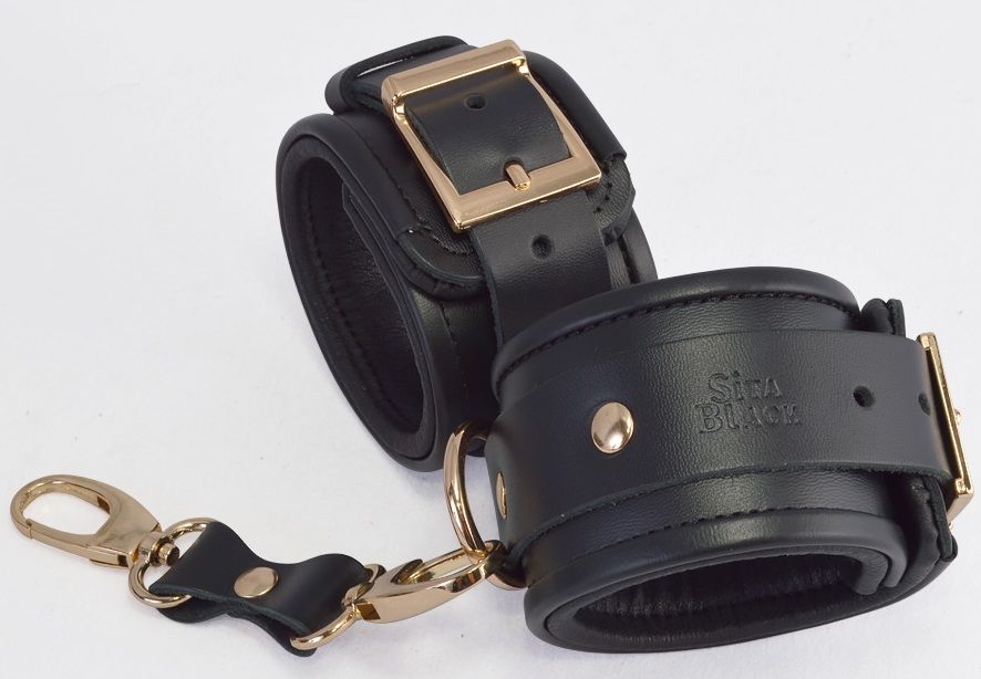Наручники из натуральной кожи в классическом лаконично-сдержанном стиле декорированы вставкой, украшенной золотыми клепками. Внутренняя часть наручников выполнена из мягкой, приятной на ощупь искусственной кожи. Соединяются между собой цепочкой с двумя карабинами. Подогнать изделие по размеру можно при помощи пряжек. Ширина - 6 см.
