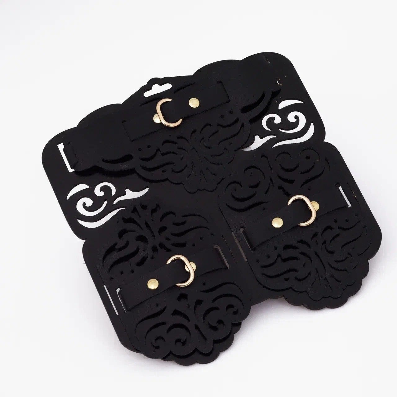 БДСМ- набор из пяти элементов. Наручники, оковы и чокер из натуральной кожи выполнены с безупречным мастерством и вниманием к деталям. Фигурная отделка с изысканными узорами придает изделиям неповторимый шарм и элегантность, а золотистая фурнитура добавляет роскоши и подчеркивает премиальный статус набора. Соединительные элементы для рук и ног позволяют создавать различные конфигурации, ограничивая движения партнера. Доставляется в фирменной упаковке в виде брендированной деревянной подложки