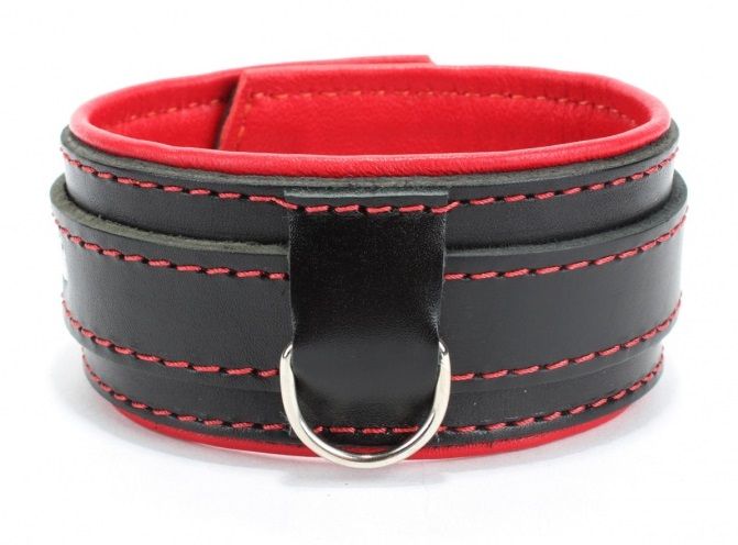 Ошейник с красным подкладом. Выполнен из толстой ременной кожи черного цвета, подклад мягкая перчаточная кожа ярко красного цвета. На пряжке. Использована усиленная металлическая фурнитура. Строчка толстой ниткой контрастного красного цвета.
